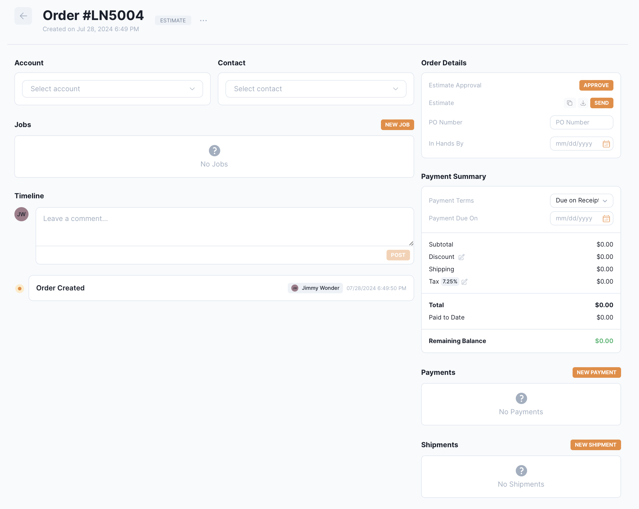 Click New Order or New Estimate in the top right corner. For this example, we’ll select New Order.